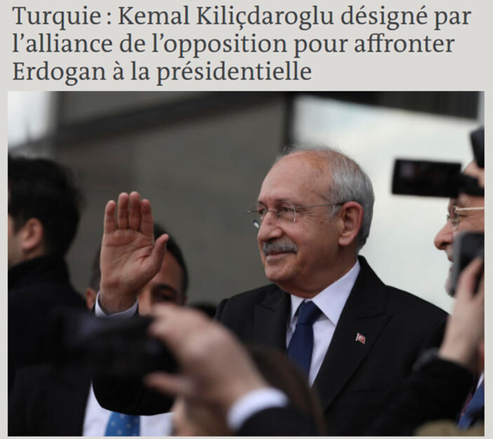 Le Monde, "Kemal Kılıçdaroğlu, cumhurbaşkanlığı seçimlerinde Erdoğan'ın karşısına muhalefet ittifakı tarafından tayin edildi." diye yazdı.