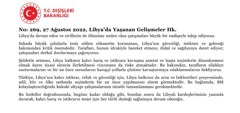 Sahada büyük çabalarla tesis edilen sükunetin korunmasının, Libya'nın güvenliği, istikrarı ve geleceği bakımından kritik önem taşıdığının belirtildiği açıklamada, "Tarafları, bunun idrakiyle hareket etmeye, itidal ve sağduyuya davet ediyor; çatışmaları derhal durdurmaya çağırıyoruz" denildi.