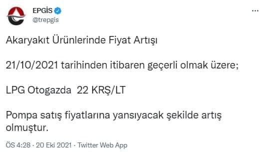 Enerji Petrol Gaz İkmal İstasyonları İşveren Sendikası’nın (EPGİS) açıklamasına göre, bu gece yarısından itibaren geçerli olacak şekilde otogazda pompa satış fiyatlarına yansıyacak şekilde 22 kuruşluk artış gerçekleşti.
