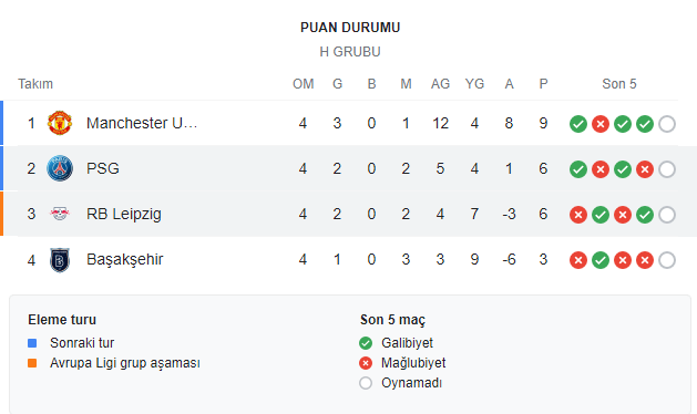 H Grubu'nda puan tablosunun zirvesinde İngiltere Premier Lig devlerinden Manchester United geliyor. Ardından Leipzig karşısında galibiyet alan PSG 2. sırada, Leipzig ise 3. sırada bulurken, Türkiye'nin temsilcisi Başahşehir son sırada yer alıyor.