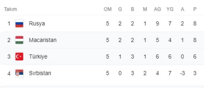 Milliler 6. karşılaşmaya hazırlanıyor. Şu anda Rusya, 8 puan ile grubun zirvesinde yer alıyor. Macaristan aynı puanla ikinci olarak Rusya'yı takip ediyor. Türkiye A Milli Futbol Takımı, 6 puanla sıralamanın 3. bölümünde yer alırken Sırbistan 3 puanla son sırada bulunuyor. Millilerin Macaristan maçından galip çıkması, liderlik yarışında oldukça kritik.