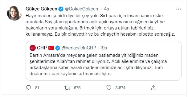 Gökçen mesajı alıntılayarak, "Hayır maden şehidi diye bir şey yok. Sırf para için insan canını riske atanlarla raporlarında açık açık uyarmasına rağmen keyfine bakanların sorumluluğunu örtmek için ortaya atılan tabirleri biz kullanamayız. Bu bir cinayettir ve bu cinayetin hesabını elbette soracağız." paylaşımında bulundu.