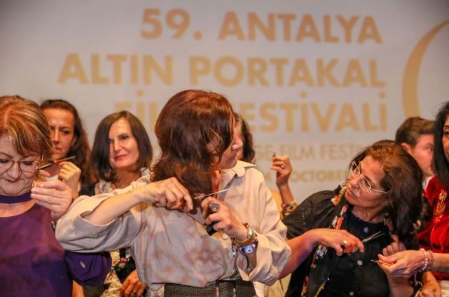 Film ekibi ve oyuncular, söyleşi sonrası İran'da saçı gözüktüğü için polis tarafından gözaltına alınan ve hayatını kaybeden Mahsa Amini'yi anmak adına sahnede saçlarını kesti. Kesik saçlar, kutuda toplandı.