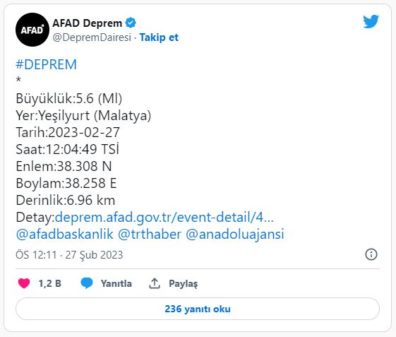 AFAD Başkanı Yunus Sezer, Twitter'dan yaptığı açıklamada, "Malatya ilimizin Yeşilyurt ilçesinde meydana gelen 5,6 büyüklüğündeki deprem sonrasında, ekiplerimiz teyakkuz halindedir. Saha tarama çalışmaları devam etmektedir" ifadelerini kullandı.