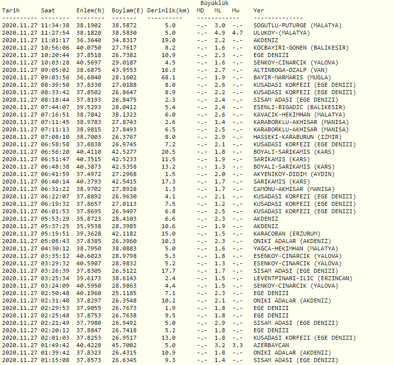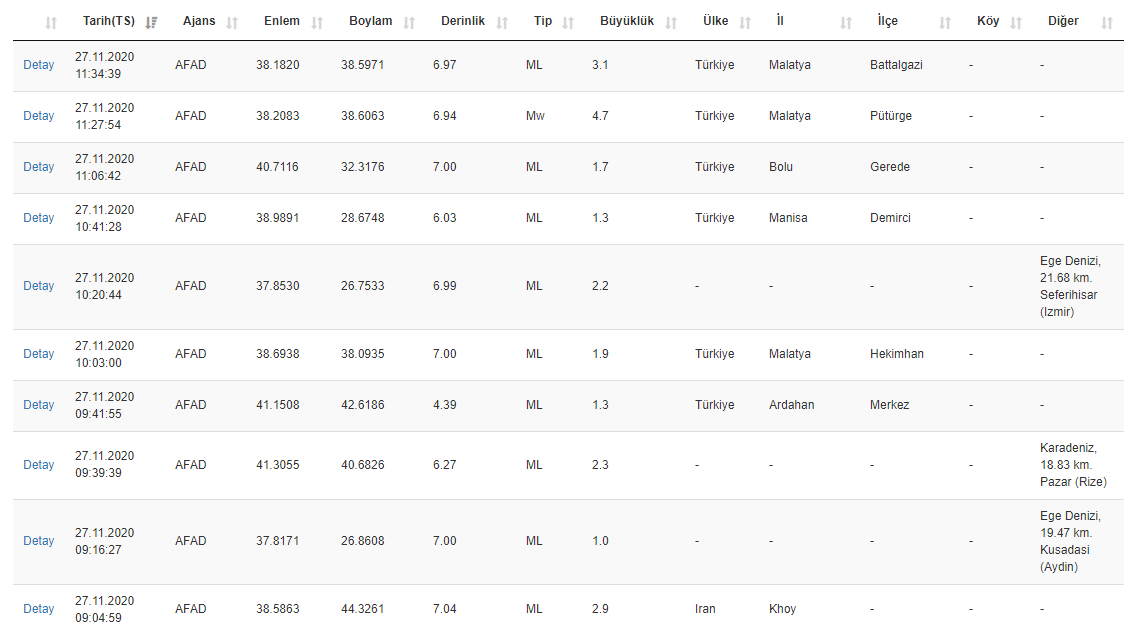 Boğaziçi Üniversitesi Kandilli Rasathanesi tarafından yapılan son deprem ölçümleri şu şekilde listeleniyor;