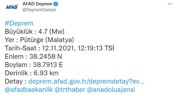 AFAD, saat 12.19'daki depremin merkez üssünün Pütürge ilçesi olduğunu duyurdu. Depremin derinliği 6,93 kilometre olarak belirlendi.
