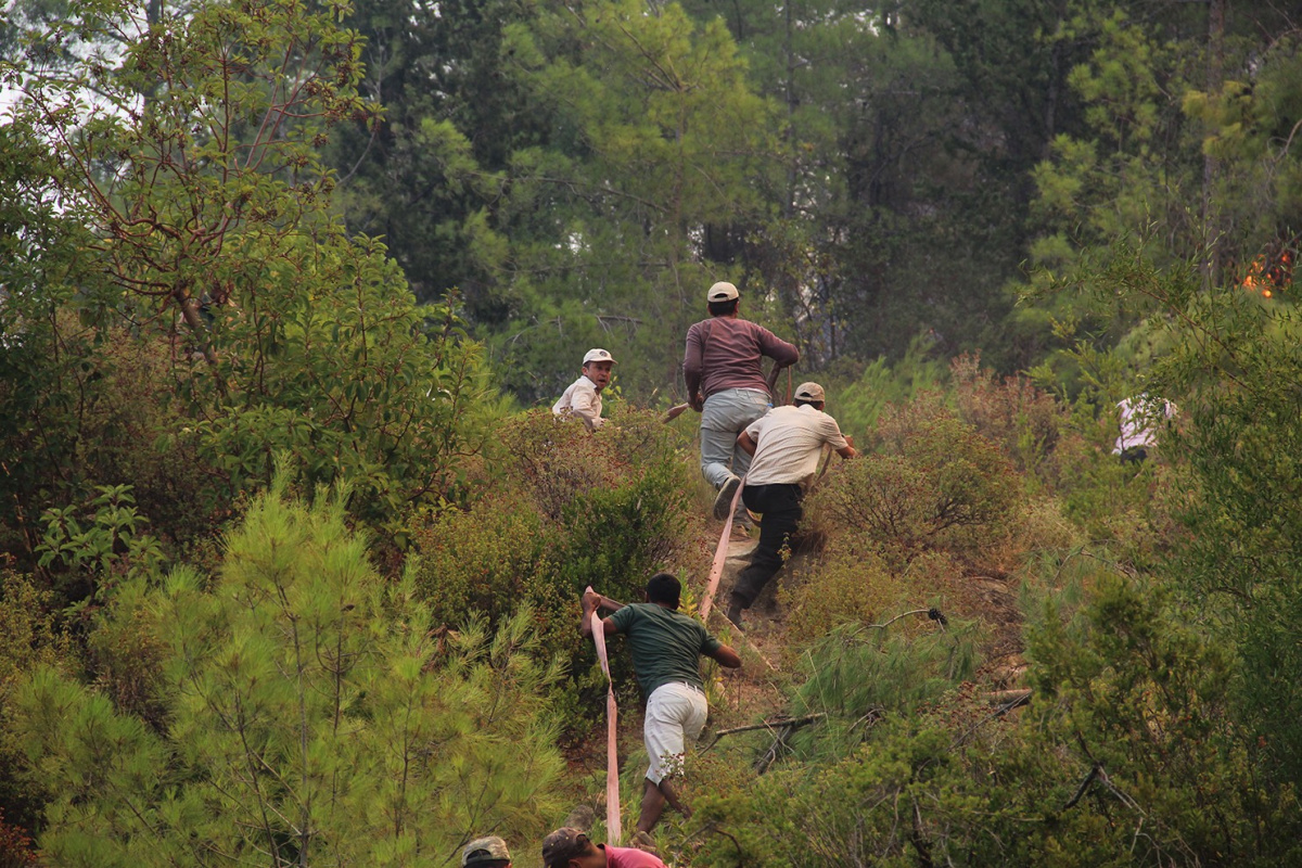 Yamaçlık alana hortum çekmeye yardım eden vatandaşlar, diğer taraftan da testereler ile kesim yapıyor. Rüzgarın etkisini sürdürdüğü bölgede kızılçam ağaçlarının zaman zaman alevlendiği görüldü.