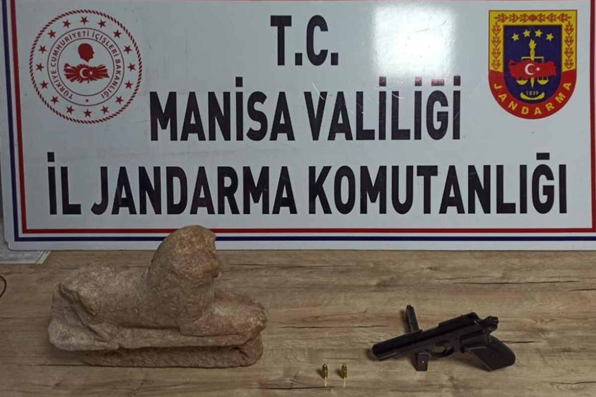 Salihli Nöbetçi Cumhuriyet Savcılığından alınan “Gecikmesinde Sakınca Bulunan Hal” kapsamında R.K.'nin ikametinde yapılan aramada 1 adet aslan heykeli ile 1 adet ruhsatsız tabanca ve 2 adet tabanca fişeği ele geçirildi. Gözaltına alınan şüphelinin işlemlerinin devam ettiği öğrenildi.