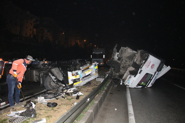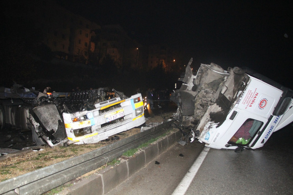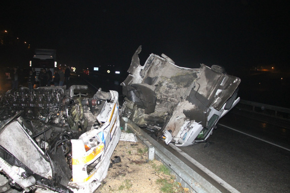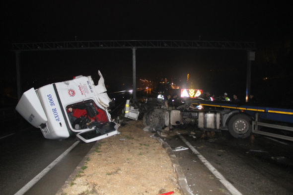 Karayolunda bir süre savrulan tır, aynı yönde seyreden Faruk Çay idaresindeki 35 AU 4853 dorse plakalı tıra arkadan çarpıp orta refüje çıktı. Kazanın şiddetiyle tırın kupası ikiye bölünürken, kupadan bölünen üst parça karşı şeride geçti.