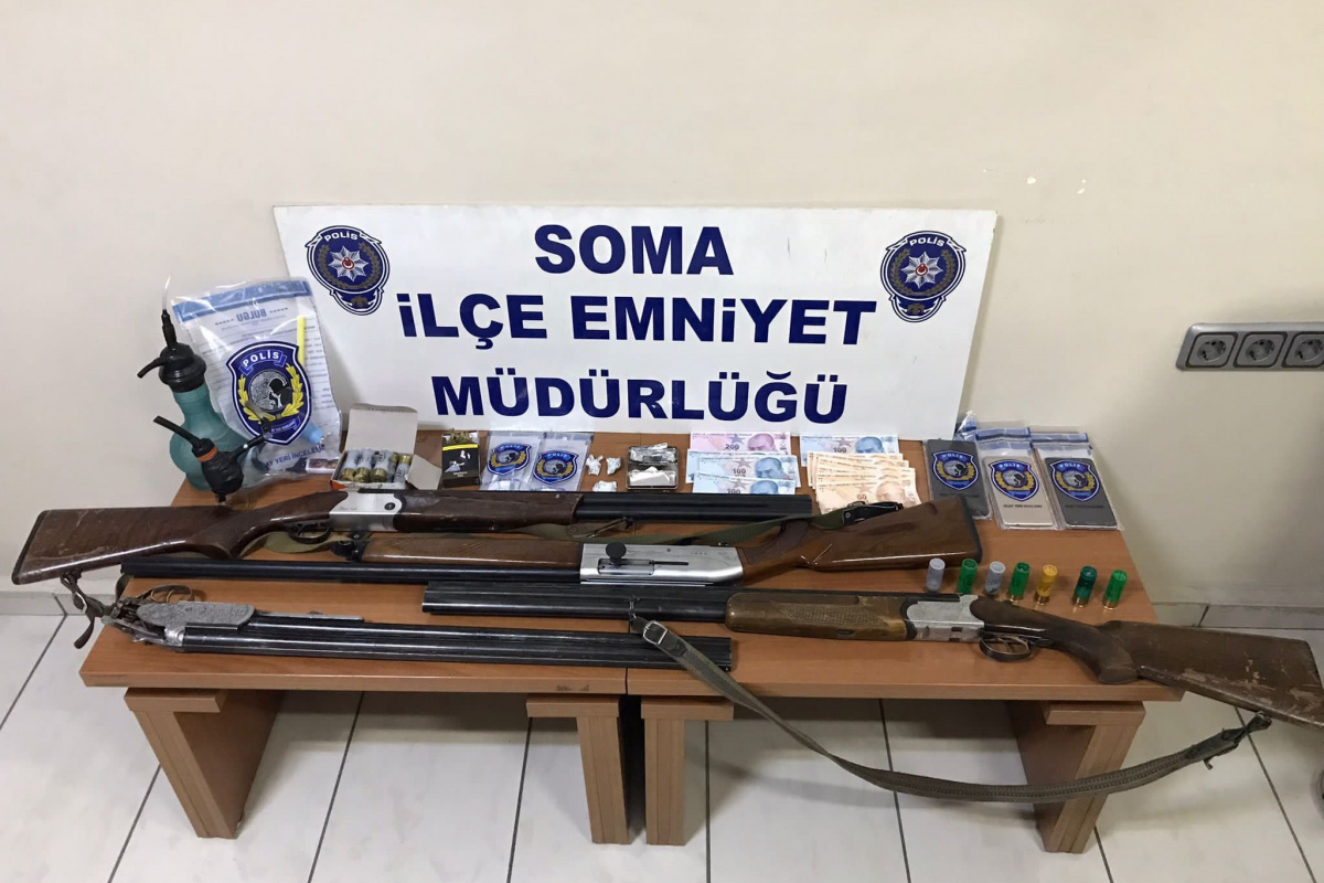 Manisa İl Emniyet Müdürlüğü Narkotik Suçlarla Mücadele Şube Müdürlüğü ve Soma İlçe Emniyet Müdürlüğü görevlilerince uyuşturucu veya uyarıcı madde ticareti yapan, nakleden ve kullanan şahıslara yönelik yapılan çalışmalar kapsamında, Soma ilçesinde 15 şahsa ait 15 ikamet adresinde sabah saat 07.00'da eş zamanlı olarak yapılan aramalarda, 8,88 gram metamfetamin maddesi, 4,5 gram esrar maddesi, 4 adet ruhsatsız tüfek, 20 adet kartuş, 5 adet uyuşturucu madde kullanmaya yarayan aparat, 2 adet çalıntı motosiklet, 900 TL uyuşturucu madde ticaretinden elde edildiği değerlendirilen para ele geçirildi.