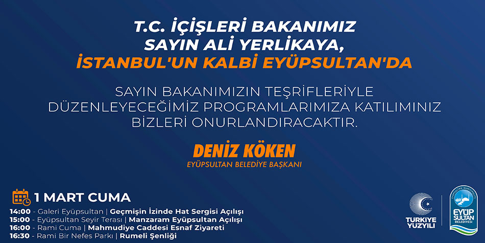 İstanbulluların yeni buluşma noktası Eyüpsultan Seyir Terası ve Manzaram Eyüpsultan, İçişleri Bakanı Sayın Ali Yerlikaya'nın teşrifleriyle hizmete açılıyor. Tarihi yarımadayı ve Haliç’i panaromik bir şekilde gözler önüne seren Eyüpsultan Seyir Terası’nda vatandaşlar, çay ve kahvelerini yudumlarken İstanbul’un eşsiz manzarasının keyfini de doyasıya çıkarabilecek.