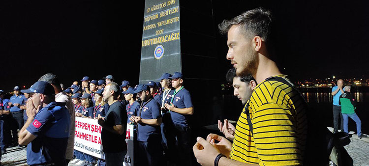 Kavaklı Sahili'ndeki Deprem Anıtı önünde Marmara Depremi'nin 23. yılı dolayısıyla düzenlenen anma etkinliğinde, felaketin yaşandığı saat olan 03.02'de saygı duruşunda bulunulup, depremde yaşamını yitirenler için dua edildi.