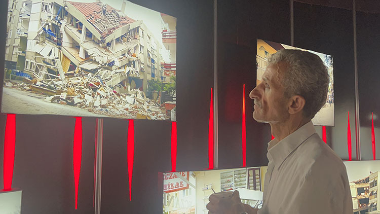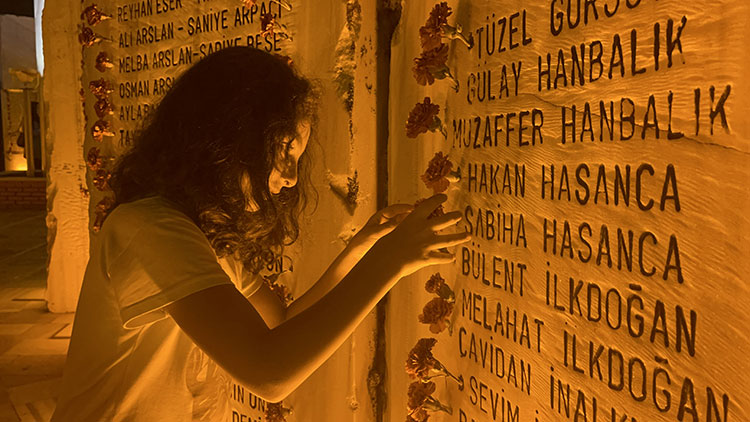Depremde hayatını kaybedenlerin isimlerinin yazılı olduğu mermer blokların bulunduğu anıta gelen katılımcılar, anıta karanfiller bırakarak deprem günü çekilen fotoğrafların bulunduğu salonları gezdi, o gün kaydedilen kurtarma görüntülerini izledi.