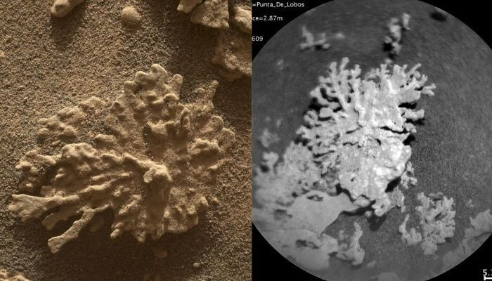 Yaklaşık 2,5 santimetre genişliğindeki kaya, gezginin Remote Micro Imager kamerasıyla siyah-beyaz olarak kayda alındı. Karmaşık dallara sahip bu oluşum, Dünya okyanuslarındaki mercan resiflerini anımsatıyor.