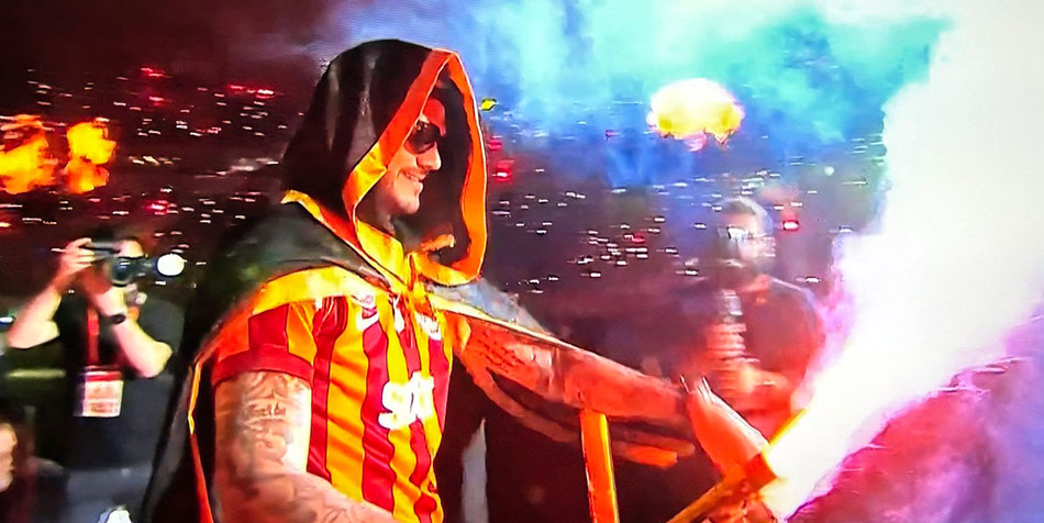 Siyah, Galatasaray logosu işlemeli pelerin giyen, ellerinde meşale olan Icardi daha sonra pelerini attı ve "orijinali geliyor" anonsu yapıldı.