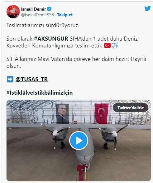 SSB Başkanı İsmail Demir, Deniz Kuvvetleri Komutanlığı'na silahlı insansız hava aracı (SİHA) Aksungur'dan 1 tane daha teslim edildiğini açıkladı.