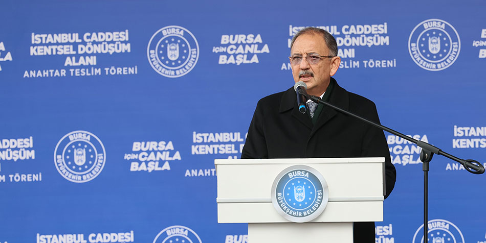 Çevre, Şehircilik ve İklim Değişikliği Bakanı Mehmet Özhaseki, Bursa’da İstanbul Caddesi kentsel dönüşüm alanındaki anahtar teslim ve toplu temel atma törenine katıldı. Yiğitler, Arabayatağı, Karapınar ve Değirmenönü kentsel dönüşüm alanlarından da canlı bağlantı kurularak gerçekleştirilen törende konuşan Bakan Özhaseki, gece-gündüz demeden kentsel dönüşüm için mesai verdiklerini söyledi. Deprem olmadan herkesin kentsel dönüşüm yapması gerektiğini vurgulayan Bakan Özhaseki, “Bu konuda belediye başkanlarımıza yardımcı olmamız lazım. Elimizden ne geliyorsa hep birlikte yapmalıyız. Biz bu işi siyaset üstü görüyoruz. Siyasi bir mesele olarak görmüyoruz. ‘Hangi belediye gelirse gelsin kapım açık derken’ bunun için söylüyorum. Bakanlık bir taraftan, belediye bir taraftan, vatandaş bir taraftan el ele verirsek, biz Türkiye'yi depremlere karşı hazırlarız. Bundan hiç kimsenin endişesi olmasın.” diye konuştu.