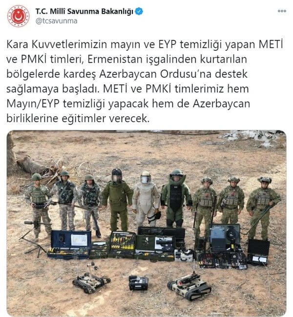 Paylaşımda EYP ve mayın temizliği görevini yapan METİ ile PMKİ timlerinin, Azerbaycan ordusunun gayretiyle Ermenistan işgalinden kurtarılan bölgelere, Azerbaycan ordusuna destek vermek amacıyla gittiği belirtildi. Açıklamaya göre söz konusu timler, bölgede hem mayın ve EYP temizliği yapacak, hem de Azerbaycan ordusuna mensup birliklere eğitim verecek.