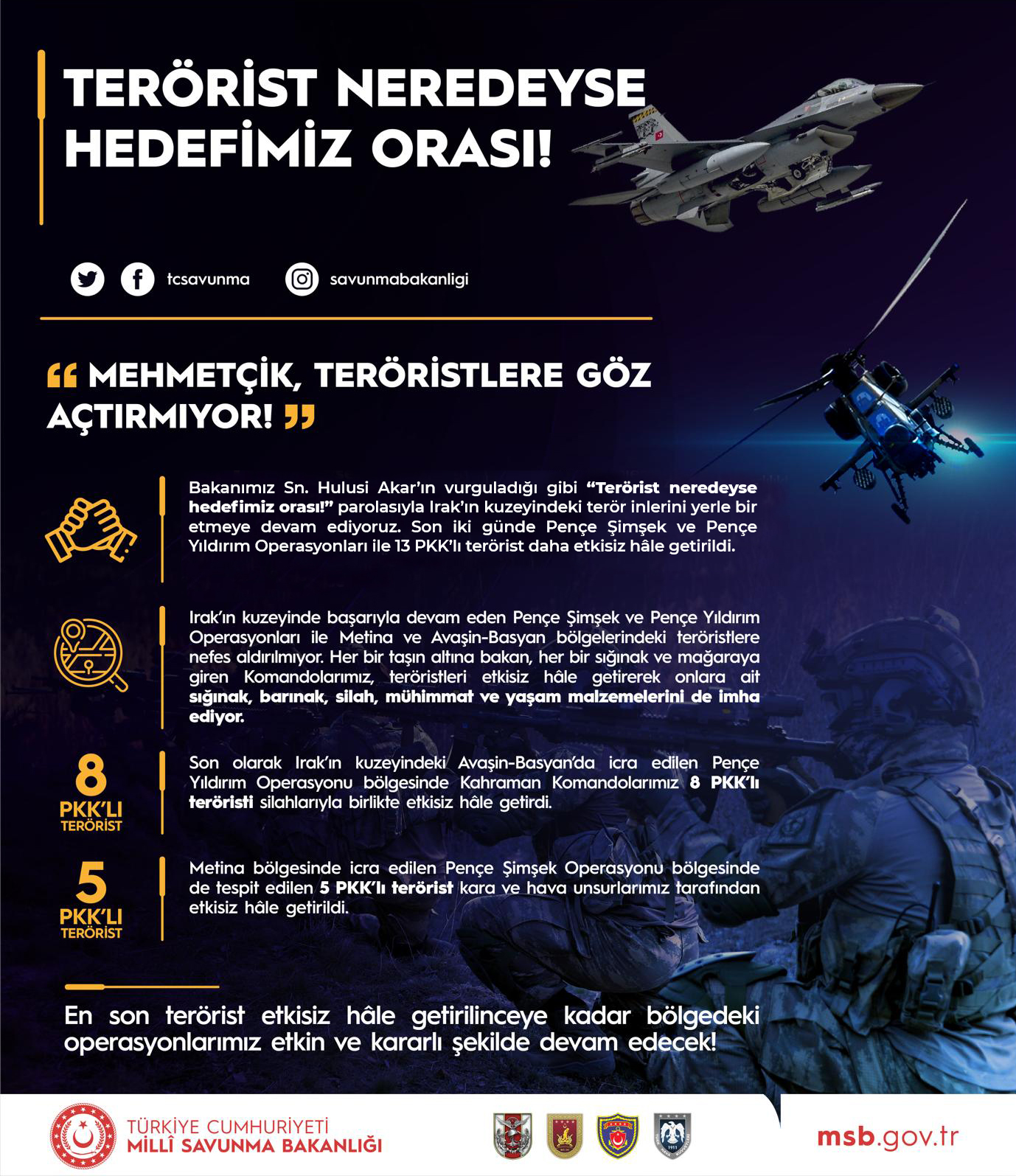 Milli Savunma Bakanlığı (MSB)'den yapılan açıklamada, "Bakanımız Sn. Hulusi Akar’ın vurguladığı gibi “Terörist neredeyse hedefimiz orası!” parolasıyla Irak'ın kuzeyindeki terör inlerini yerle bir etmeye devam ediyoruz. Son iki günde Pençe Şimşek ve Pençe Yıldırım Operasyonları ile 13 PKK’lı terörist daha etkisiz hâle getirildi." denildi.