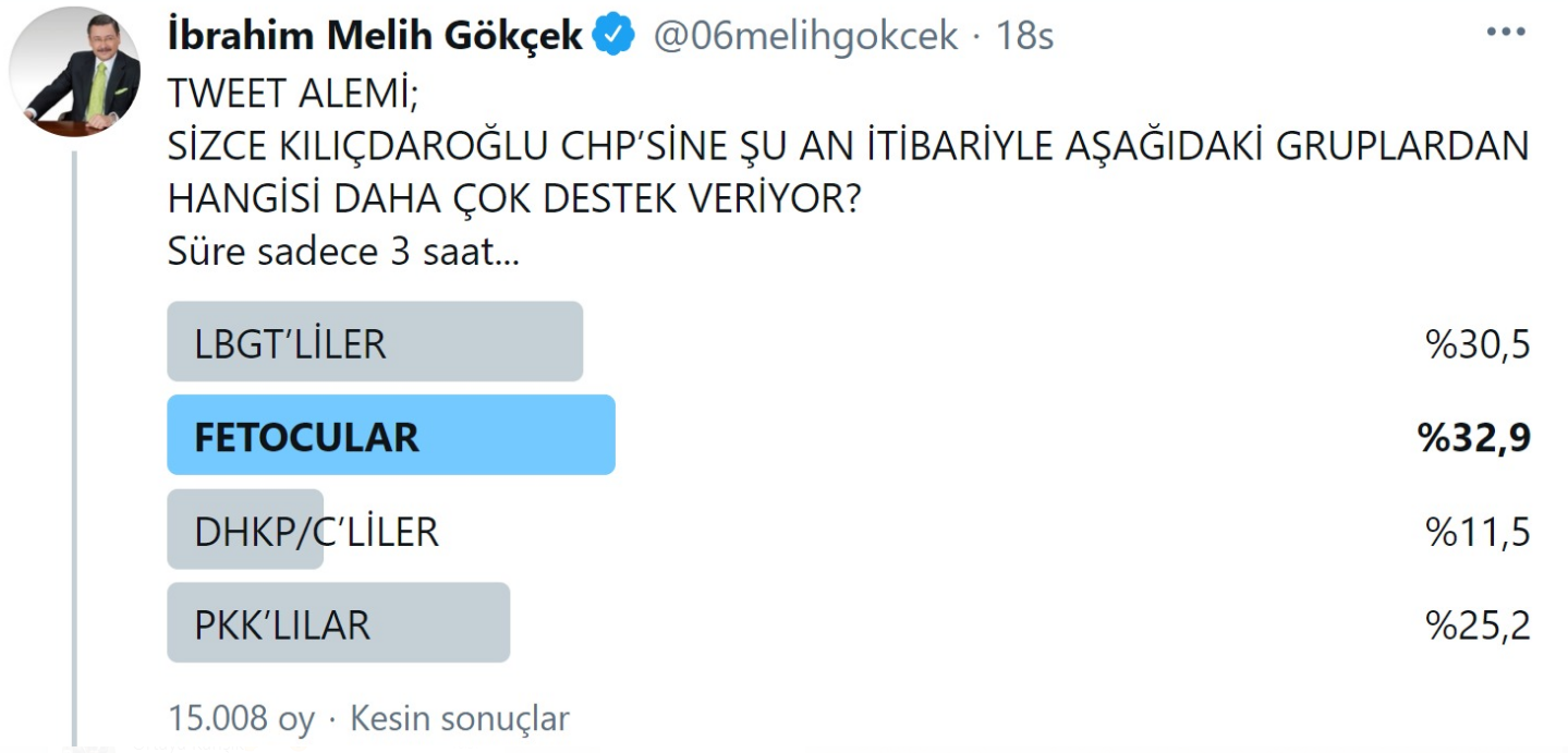 Gökçek'in "Sizce Kılıçdaroğlu CHP'sine şu an itibariyle hangi grup daha çok destek veriyor?" sorusunu yönelttiği anket 15 bin 8 kişi katıldı.