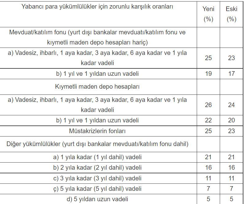 Yapılan değişiklik sonucu TCMB'nin yabancı para yükümlülükler için zorunlu karşılık oranları şöyle: