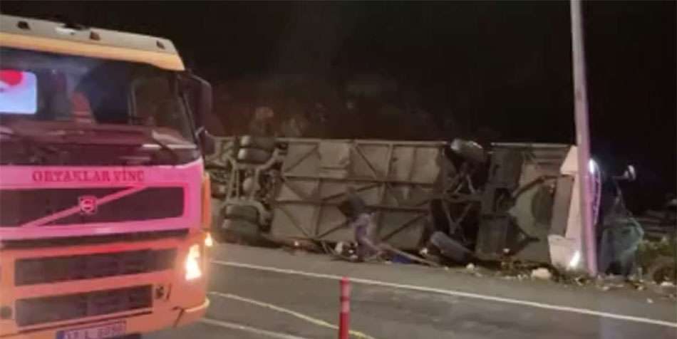 Marmaris'ten Mardin'e giden ve sürücüsünün ismi henüz öğrenilemeyen 47 NA 767 plakalı şehirler arası yolcu otobüsü, D-400 kara yolunun Yenikaş Mahallesi yakınında bariyere çarpıp devrildi.
