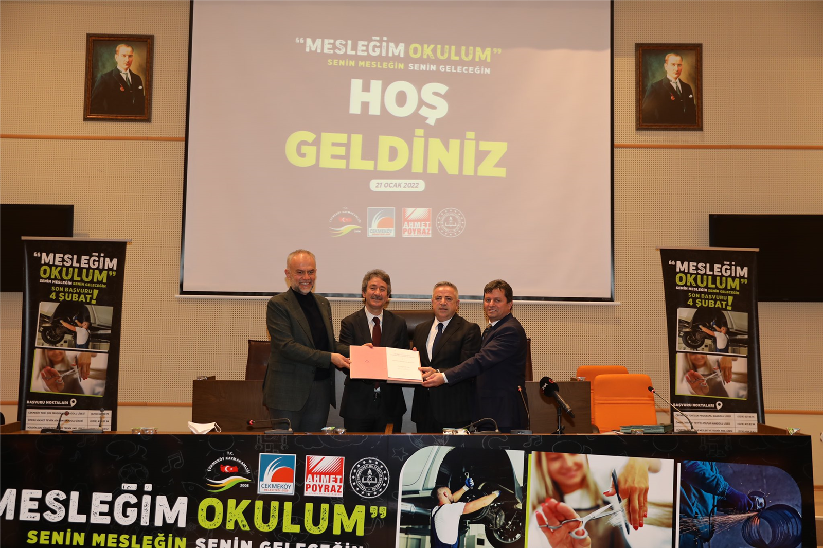Çekmeköy Kaymakamlığı, Çekmeköy Belediyesi ve Çekmeköy İlçe Milli Eğitim Müdürlüğü işbirliği ile hayata geçirilen Mesleğim Okulum projesi için imzalar atıldı. Çekmeköy Belediye Başkanı Ahmet Poyraz’ın ev sahipliğinde belediye binasında gerçekleşen imza törenine; Çekmeköy Kaymakamı Resul Çelik, İl Milli Eğitim Müdürü Levent Yazıcı, İlçe Milli Eğitim Müdürü Burhan Bayrak, meclis üyeleri, öğretmenler ve iş adamları katıldı.