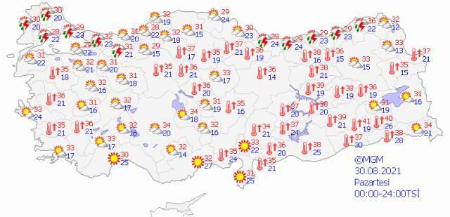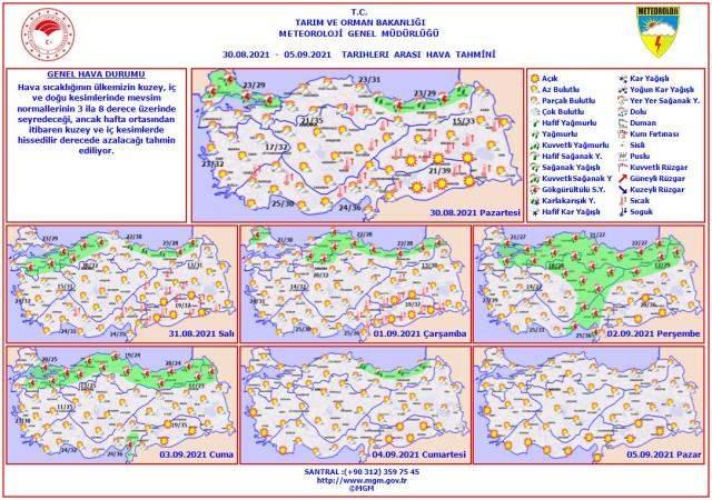 Meteoroloji Genel Müdürlüğü, 30 Ağustos-05 Eylül tarihlerini kapsayan haftalık hava tahminini paylaştı. Ayrıca bugün için 11 kente sağanak yağış uyarısı yapıldı.