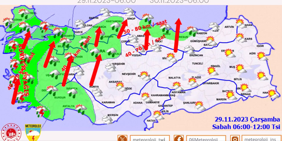 İstanbul Valiliği'nden yapılan açıklamada, "Yapılan son değerlendirmelere göre gece saatlerinden sonra İstanbul Avrupa yakasından başlayarak 29.11.2023 Çarşamba günü sabah saatlerinden itibaren İstanbul il genelinde yerel olarak kuvvetli sağanak ve gök gürültülü yağış beklenmektedir" denilirken ani sel, su baskını, yıldırım, yerel dolu yağışı, ani kuvvetli rüzgar ve kısa süreli fırtına ile ulaşımda aksamalar olabileceğini belirtilerek vatandaşlar uyarıldı.