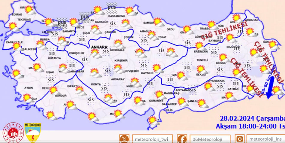 Doğu Karadeniz’in iç kesimleri ile Doğu Anadolu’nun kuzey ve doğusunda yüksek kar örtüsü bulunan yerlerde çığ tehlikesi bulunmaktadır. Sabah ve gece saatlerinde Marmara ile iç ve doğu kesimlerde pus ve yer yer sis hadisesi bekleniyor.