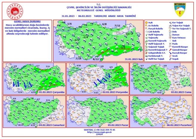 Meteoroloji Genel Müdürlüğü tarafından yapılan son değerlendirmelere göre: Ülkemiz genelinin çok bulutlu, Marmara, İç Ege, Akdeniz, İç Anadolu, Batı ve Orta Karadeniz, Doğu Anadolu (Erzincan ve Ardahan hariç), Güneydoğu Anadolu ile Giresun, Trabzon ve Rize çevrelerinin yağışlı geçeceği tahmin ediliyor.
