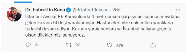 Sağlık Bakanı Fahrettin Koca İstanbul'da meydana gelen metrobüs kazası ile ilgili sosyal medya hesabından açıklama yaptı.