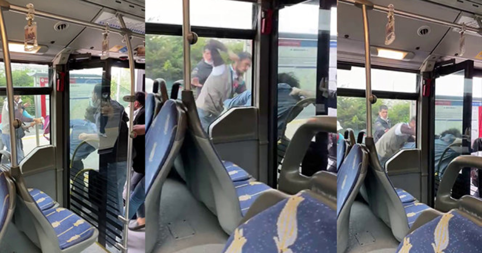 Üsküdar’da metrobüste 2 grup arasındaki münakaşa tekmeli ve yumruklu kavgaya dönüştü. Yaşanan o anlar diğer bir yolcunun cep telefonu kamerasına yansıdı.