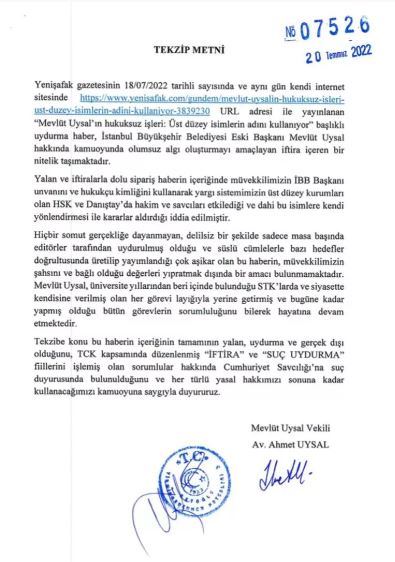 Yeni Şafak gazetesinin 18/07/2022 tarihli sayısında ve aynı gün kendi internet sitesinde https://www.yenisafak.com/gundem/mevlut-uysalin-hukuksuz-isleri-ust-duzey-isimlerin-adini-kullaniyor-3839230 URL adresi ile yayınlanan ‘Mevlüt Uysal’ın hukuksuz işleri: Üst düzey isimlerin adını kullanıyor” başlıklı uydurma haber, İstanbul Büyükşehir Belediyesi Eski Başkanı Mevlüt Uysal hakkında kamuoyunda olumsuz algı oluşturmayı amaçlayan iftira içeren bir nitelik taşımaktadır.