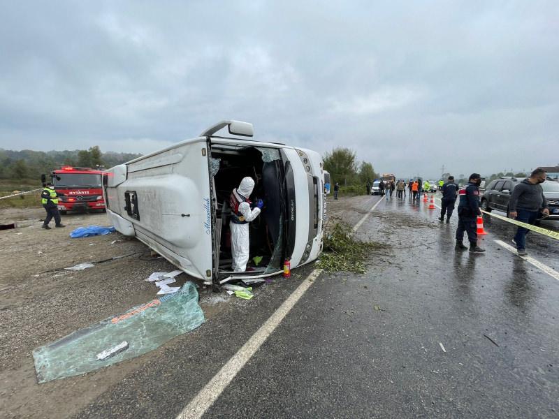 Yağmur nedeniyle kayganlaşan yolda sürücüsünün direksiyon hakimiyetini kaybettiği midibüs devrildi.