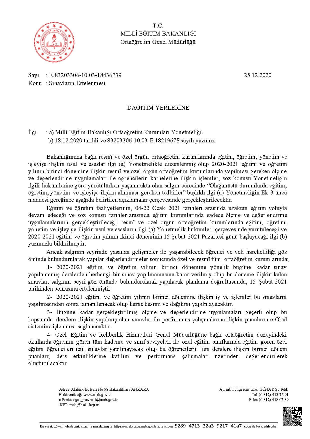 Genelgeye göre bugüne kadar yapılmamış sınavlardan herhangi bir sınav yapılmamasına ilişkin karar alındı. Bu sınavların, koronavirüs salgını seyri de göz önüne alınarak yapılacak planlama ışığında 15 Şubat 2021 tarihinin sonrasına ertelendi.
