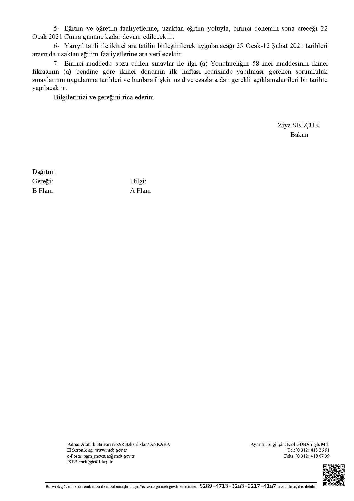 Genelgede 4 Ocak ve 22 Ocak 2021 tarihleri arasında eğitimin uzaktan eğitim yöntemi ile devam edeceği ve belirtilen tarihler arasında eğitim kurumlarında yalnızca ölçme ve değerlendirme uygulamalarının yapılacağı belirtildi.