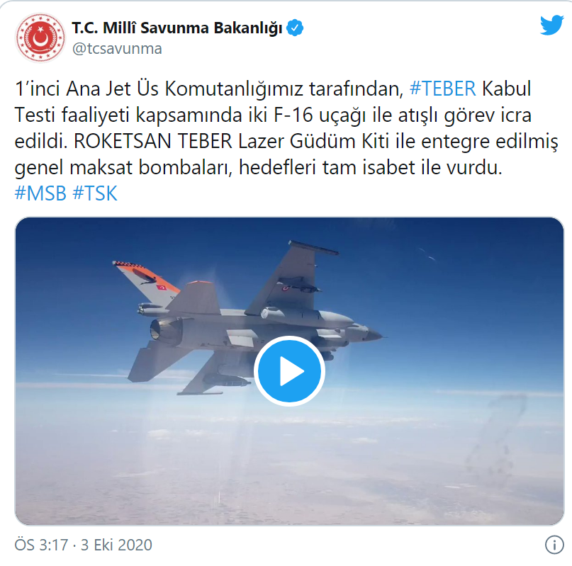 "1’inci Ana Jet Üs Komutanlığımız tarafından, #TEBER Kabul Testi faaliyeti kapsamında iki F-16 uçağı ile atışlı görev icra edildi. ROKETSAN TEBER Lazer Güdüm Kiti ile entegre edilmiş genel maksat bombaları, hedefleri tam isabet ile vurdu."