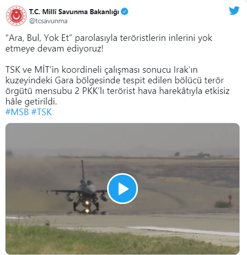 TSK ve MİT’in koordineli çalışması sonucu Irak'ın kuzeyindeki Gara bölgesinde tespit edilen bölücü terör örgütü mensubu 2 PKK’lı terörist hava harekâtıyla etkisiz hâle getirildi.