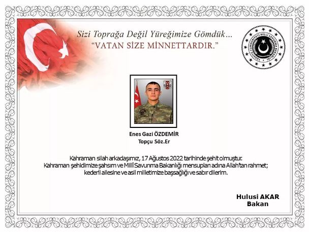 Milli Savunma Bakanlığı'ndan yapılan açıklamada, "Birecik/Şanlıurfa hududunda, 16 Ağustos 2022 tarihinde, teröristlerce yapılan havan tacizi sonucunda yaralanarak hastaneye sevk edilen kahraman silah arkadaşımız Topçu Sözleşmeli Er Enes Gazi Özdemir, yapılan tüm müdahalelere rağmen kurtarılamayarak 17 Ağustos 2022 tarihinde şehit olmuştur. Bizleri derin bir acı ve üzüntüye boğan bu olayda hayatını kaybeden aziz şehidimize Allah'tan rahmet, kederli ailesine, Türk Silahlı Kuvvetleri ile asil milletimize başsağlığı ve sabır dileriz." ifadeleri kullanıldı.
