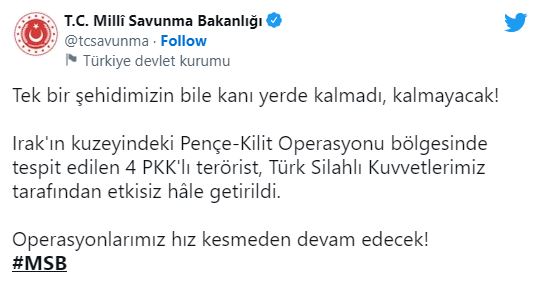 Milli Savunma Bakanlığı'ndan yapılan açıklamada, Irak'ın kuzeyindeki Pençe-Kilit Operasyonu bölgesinde tespit edilen 4 PKK'lı teröristin, Türk Silahlı Kuvvetleri tarafından etkisiz hale getirildiği belirtildi.