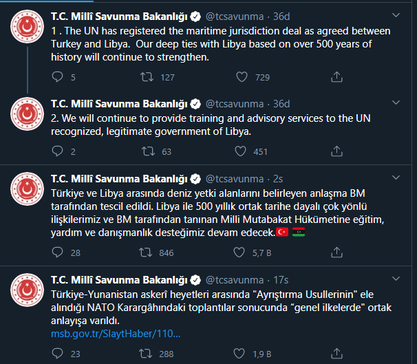 "Türkiye ve Libya arasında deniz yetki alanlarını belirleyen anlaşma BM tarafından tescil edildi. Libya ile 500 yıllık ortak tarihe dayalı çok yönlü ilişkilerimiz ve BM tarafından tanınan Milli Mutabakat Hükümeti'ne eğitim, yardım ve danışmanlık desteğimiz devam edecek."