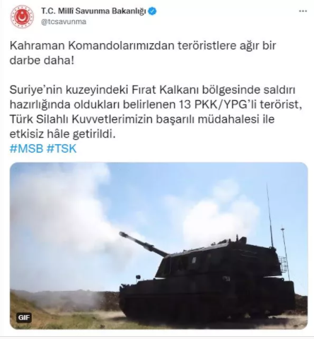 "Kahraman Komandolarımızdan teröristlere ağır bir darbe daha! Suriye’nin kuzeyindeki Fırat Kalkanı bölgesinde saldırı hazırlığında oldukları belirlenen 13 PKK/YPG’li terörist, Türk Silahlı Kuvvetlerimizin başarılı müdahalesi ile etkisiz hâle getirildi."