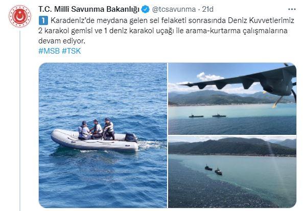 Milli Savunma Bakanlığı (MSB), "Karadeniz’de meydana gelen sel felaketi sonrasında Deniz Kuvvetlerimiz 2 karakol gemisi ve 1 deniz karakol uçağı ile arama-kurtarma çalışmalarına devam ediyor." paylaşımında bulundu.