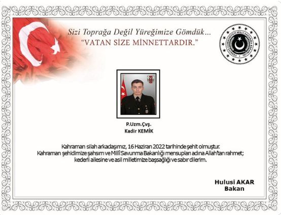 Pençe-Kilit operasyonu bölgesinde 16 Haziran 2022 tarihinde bir üs bölgemize bölücü terör örgütü mensuplarınca açılan taciz ateşi sonucunda kahraman silah arkadaşımız P.Uzm.Çvş. Kadir KEMİK yaralanarak derhal hastaneye sevk edilmiş, ancak yapılan tüm müdahalelere rağmen kurtarılamayarak şehit olmuştur.