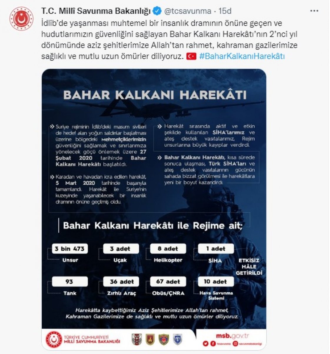 Bahar Kalkanı Harekatı ile rejime ait 3 bin 473 terörist, 3 adet uçak, 8 adet helikopter, 1 adet SİHA, 93 tank, 36 adet zırhlı araç, 67 adet obüs ve 10 adet hava savunma sistemi etkisiz hale getirildi.