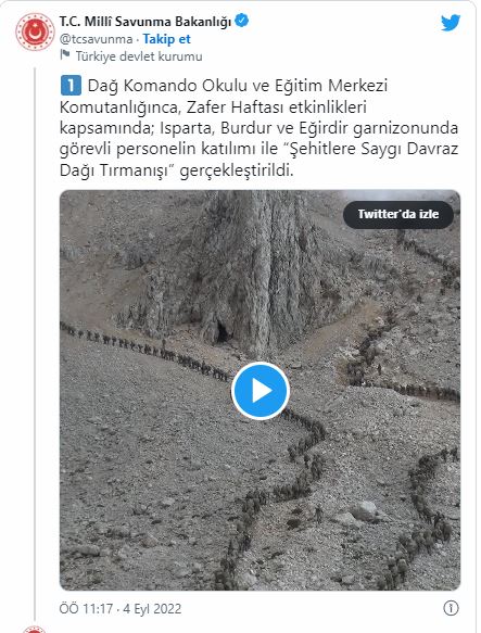 "Dağ Komando Okulu ve Eğitim Merkezi Komutanlığınca, Zafer Haftası kapsamındadır; Isparta, Burdur Eğirdir garnizonunda gözlemleniyor ile "Şehitlere Dağı Tırmanışı" yaşanıyor.