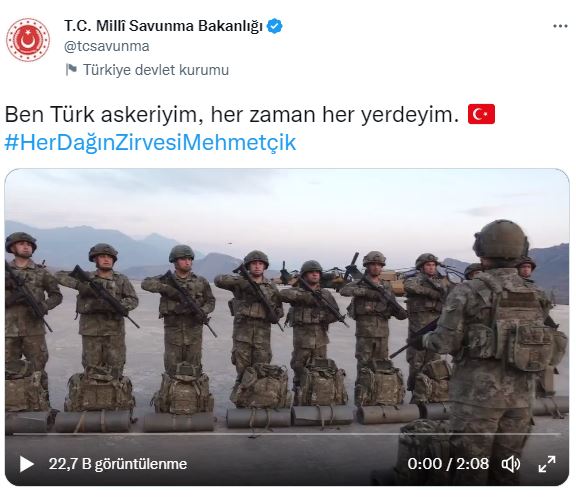 Milli Savunma Bakanlığı'nın (MSB) Twitter hesabından "Ben Türk askeriyim, her zaman her yerdeyim" notu ve "Her Dağın Zirvesi Mehmetçik" etiketiyle paylaşılan görüntülerde, bir asker, silah arkadaşlarına, "Kahraman komandolar, kahraman silah arkadaşlarım; bugün oldukça önemli bir operasyona katılacağız. Operasyon bölgesinde silah arkadaşlarımız bizleri beklemekte. Analarımızın ve Türk milletinin dualarıyla son terörist etkisiz hale gelinceye kadar mücadelemiz devam edecektir. Komandolar, başarılar." diye sesleniyor.