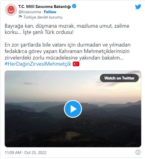 "Her dağın zirvesi Mehmetçik" videosu, "Bayrağa kan, düşmana mızrak, mazluma umut, zalime korku. İşte şanlı Türk ordusu. En zor şartlarda bile vatanı için durmadan ve yılmadan fedakarca görev yapan kahraman Mehmetçiklerimizin zirvelerdeki zorlu mücadelesine yakından bakalım." ifadeleriyle paylaşıldı.