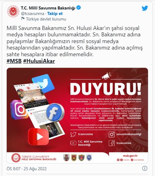 "Bakanımız, Kuvvet Komutanlıklarımız ve birliklerimize ilişkin resmî açıklamalar Bakanlığımızın resmî sosyal medya hesaplarından yapılmaktadır. Kuvvetlerimiz adına açılmış sahte hesaplara itibar edilmemelidir."